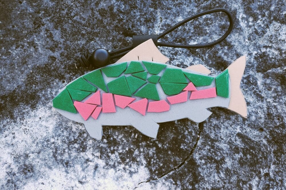 The charm is fairly simple. It’s just a few different colors of craft foam that I cut in the shape of a trout and glued together with a mosaic pattern. It attaches to the saddle rails via a shock cord and a loop of grosgrain sewn to the back.