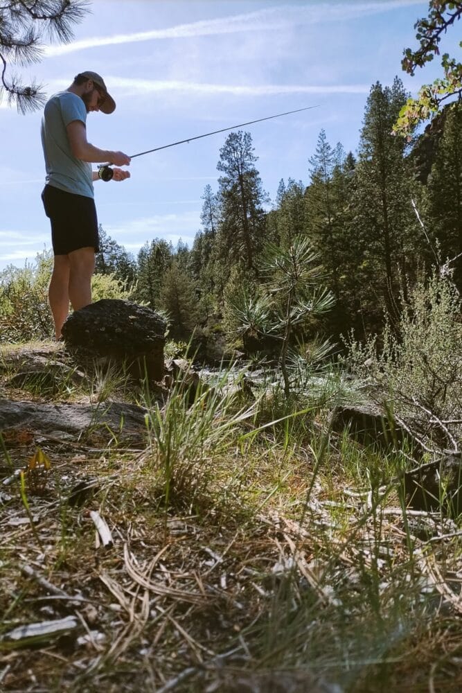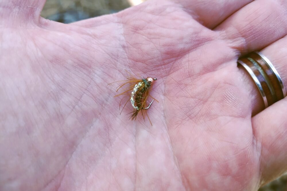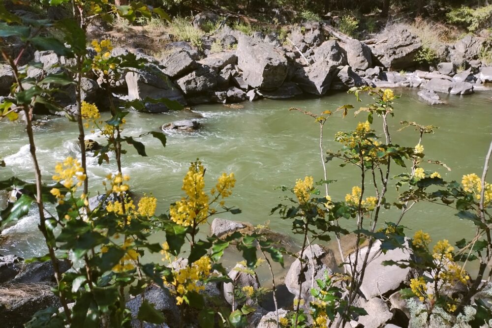 I walk upstream to a familiar spot currently guarded by flowering Oregon grape bushes. I sit and take my fly box out of my fishing pack. Nymphs, for sure. I pick a sparkly nymph tied by my friend’s dad and tie it four feet below a hopper.