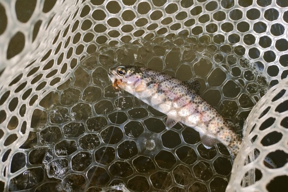 It’s a small rainbow. They’re almost always small. But it’s pretty. They’re almost always pretty. This one’s spotted dorsal fin catches my eye.
