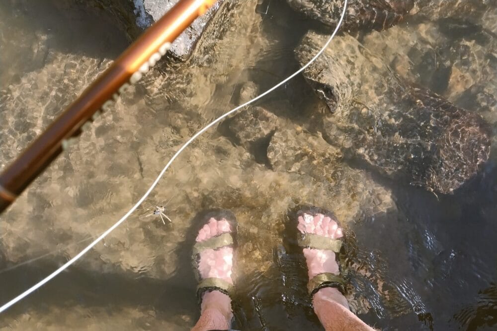 I cast and watch in pool after pool without success. I continue to a section of the river where large flat rocks make easy landing platforms for an early-season fly fisher. I notice a snagged fishing line on a rock at the end of a run I want to fish. I can avoid that, my brain confidently thinks.