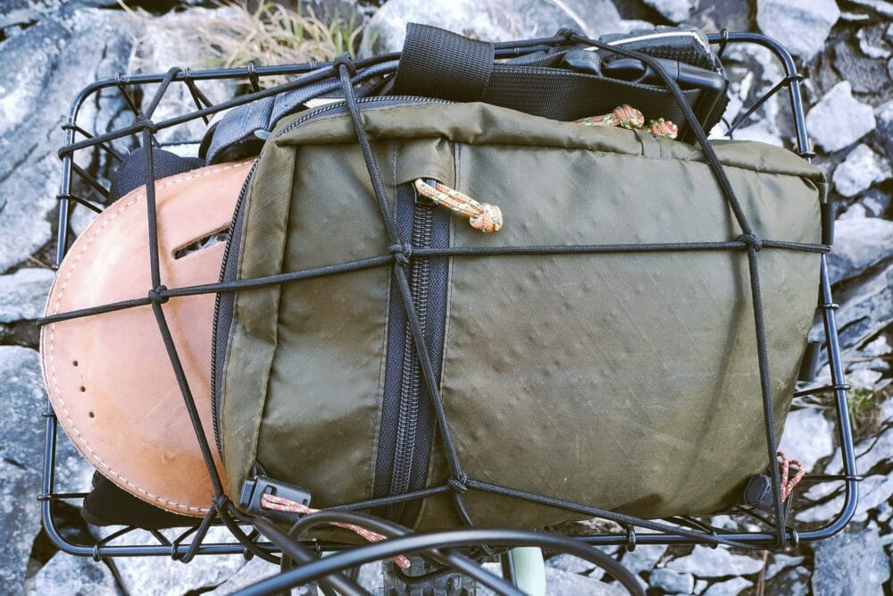 I packed the net in my Grappler’s frame bag before the basketpacking setup. My Grappler frame has an enormous front triangle that fits all my fishing and biking gear.