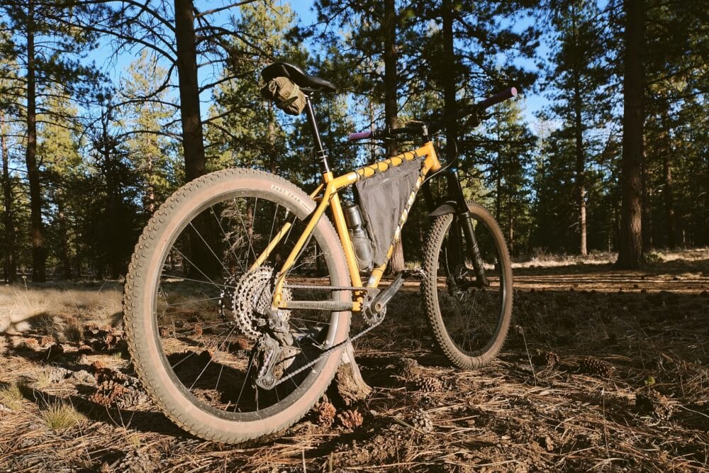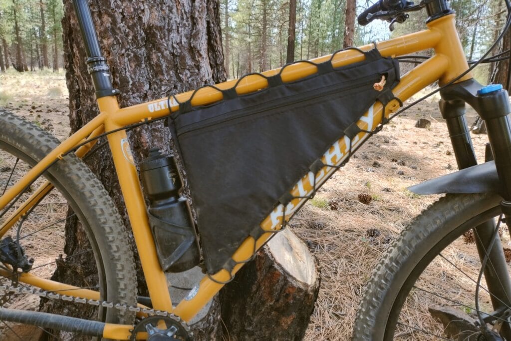 I use a wedge frame bag on my Ritchey Ultra to carry my hand pump, snacks, water filter, sunscreen, and basic bikefishing gear. The wedge style allows me to run a full-size 26-oz water bottle on the seat tube.